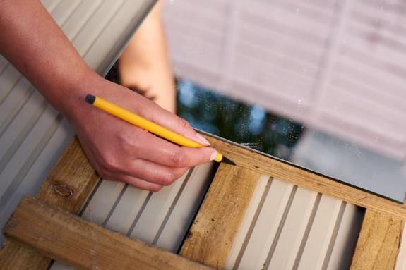 Apply glue to the back of trellis, push down firmly onto the front of the mirror and allow to dry before screwing to the fence with brackets.