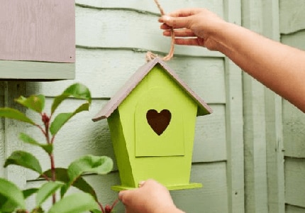 When the paint has dried, you can hang your bird box using hooks and string to secure it to a garden shed or fence.