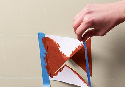 Gently peel off the masking tape and reposition the stencil to fill in every other tile with the first colour. Allow to dry.