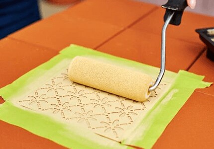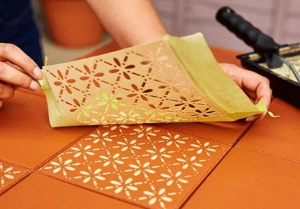 Mask round the tile you are going to decorate then position the stencil and hold it in place with masking tape.